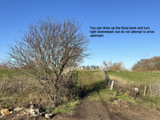 Upstream – Although you can drive along the top of the flood bank, it is narrow and there is no parking at the other end. In a warmer/dryer months, it may be possible to drive along the bottom of the flood bank but during the winter this area can be a bog. YOU WILL GET TRAPPED.