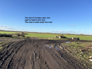Cornley Road starts as a metalled road but half way along changes into an unmade farm track. It is solid but, inevitably, uneven. After 2 miles you reach a sharp right angle turn to the right. Stay on this track for a further 1/4 mile which ends at the flood bank where you will see SAA signs.