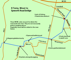 Epworth Road/West End Road – ///work.slave.obstruct The start of our stretch, no parking past the metal gate on the lane but you can walk down the bank to fish here.