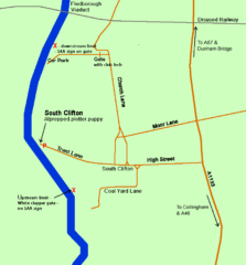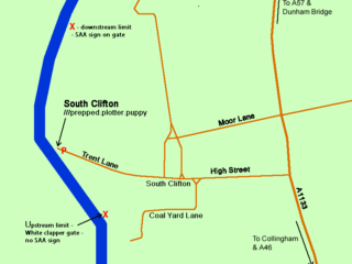 For the upstream car park (Trent Lane) turn right onto High St, S Clifton and go straight on. After just over 1/2 mile, the metalled road ends and you enter the unmade Trent Lane. Keep going but take care. The lane ends at our gate just below the flood bank. Park carefully so as not to obstruct the track and gate.